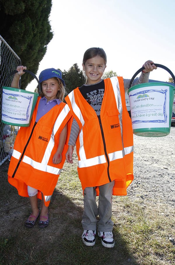 Mapua sisters Sarsha and Tia Mytton, 6 and 8 years old respectively, collect gold coin donations at the gate during Sunday’s Mapua Easter Fair.